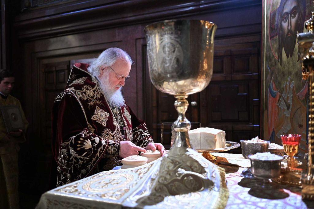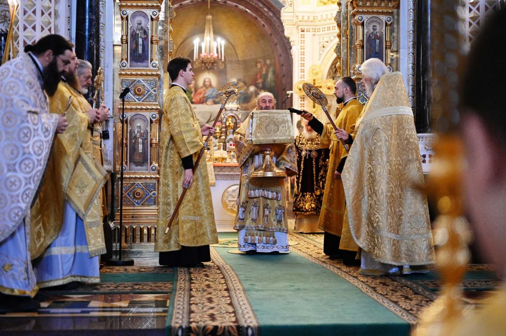 После сугубой ектении митрополит Крутицкий и Коломенский Ювеналий вознес молитву о Предстоятеле Русской Православной Церкви — Святейшем Патриархе Московском и всея Руси Кирилле.